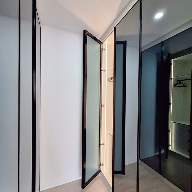 Geräumiges, helles Schlafzimmer mit 3 Fenstern und direktem Zugang zum Balkon. Zum Schlafzimmer gehört ein Raum, der als Ankleidezimmer genutzt wird.