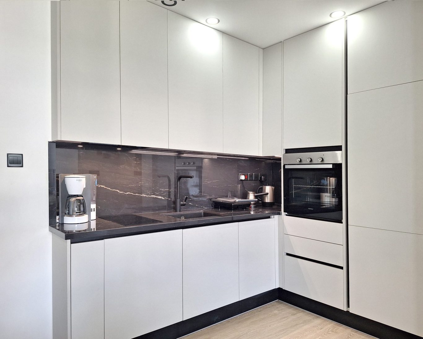 Geräumiges Wohnzimmer mit offener Küche, Zugang zum Balkon direkt vom Wohnzimmer. Der Balkon erstreckt sich über die gesamte Länge der Wohnung. Das ausklappbare Sofa bietet zwei zusätzliche Schlafplätze.