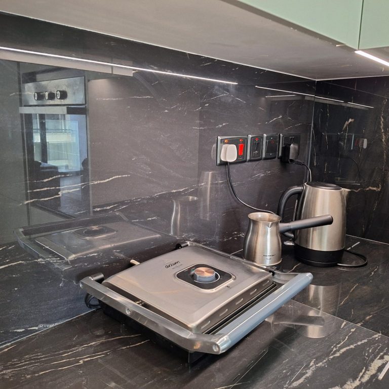 Moderne Küche ausgestattet mit Geschirrspüler, Backofen, Kochfeld, Dunstabzugshaube, Kühlschrank und Gefrierfach. Zudem stehen den Gästen eine Kaffeemaschine, ein türkischer Kaffeekocher, ein Wasserkocher und ein Panini-Grill zur Verfügung.
