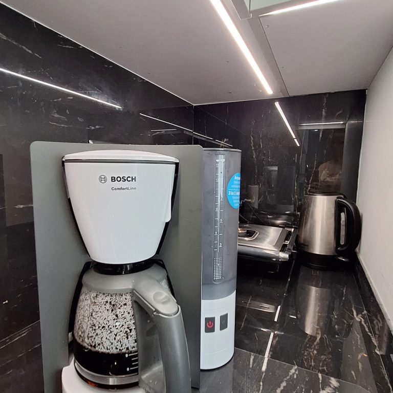 Ein Durchlauf-Kaffeeautomat, ein Panini-Grill sowie ein Wasserkocher stehen den Gästen zur Verfügung