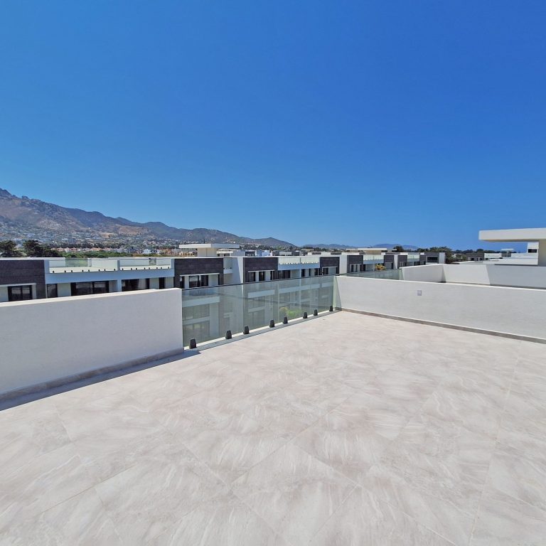 Dachterrasse mit einer Fläche von 55 m², auf der einen Seite Meerblick, auf der anderen Seite Blick auf die Berge. Ausgestattet mit Gartenmöbeln und Sonnenschirm.