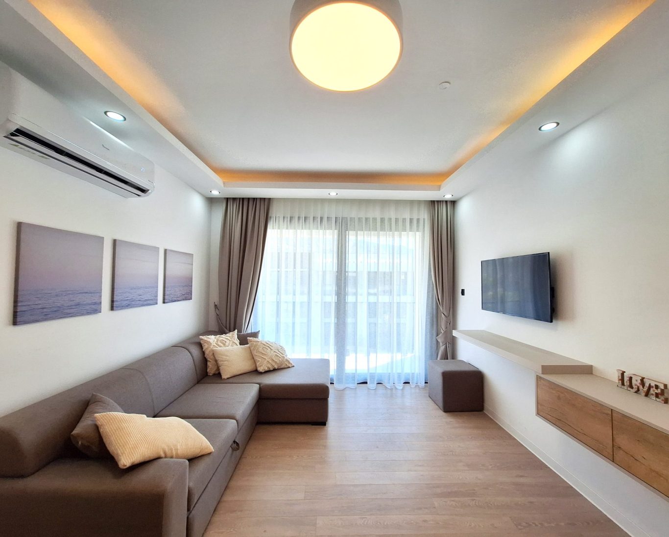 Geräumiges Wohnzimmer mit offener Küche, Zugang zum Balkon direkt vom Wohnzimmer. Der Balkon erstreckt sich über die gesamte Länge der Wohnung. Das ausklappbare Sofa bietet zwei zusätzliche Schlafplätze.